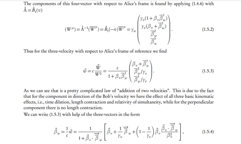 The discussion revolves around the transition from equation 1.5.3 to equation 1.5.4 in the context of special relativity, specifically focusing on the representation of these equations using three-vectors. Participants explore the assumptions and implications of these equations, as well as the methods for deriving one from the other.