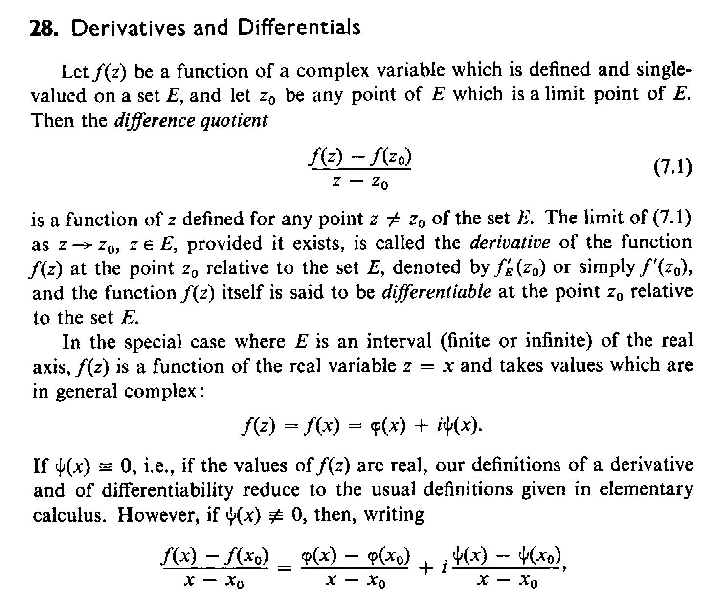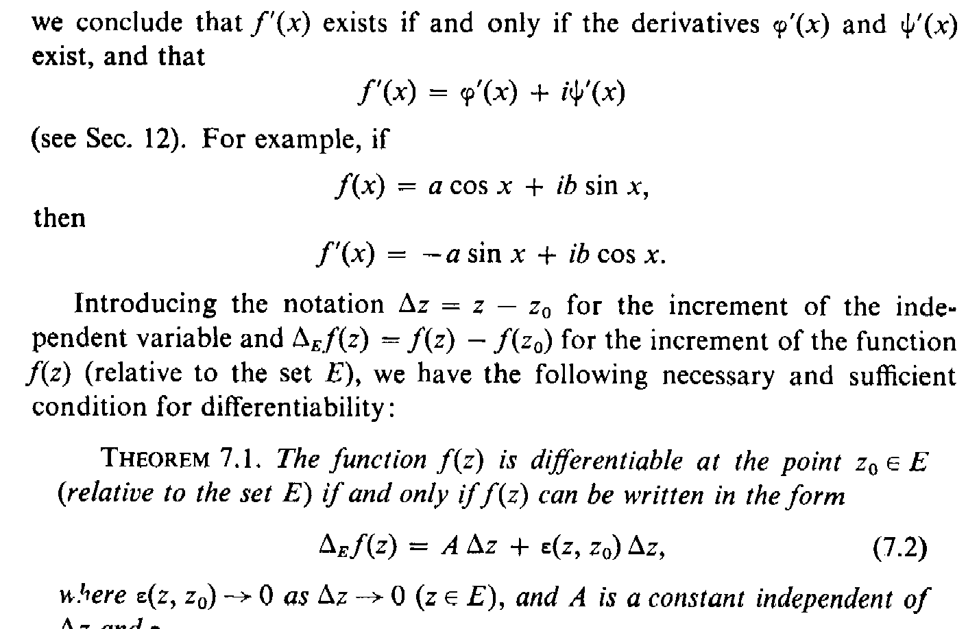 $$f'_E(z_0) = \frac{ f(z) - f(z_0) }{ z - z_0 } = \frac{ \Delta_E f(z) }{ \Delta z }$$ ... ... ... (1)How exactly (formally and rigorously) is equation (1) exactly the same as $$\frac{ \Delta_E f(z) }{ \Delta z } = f'_E(z_0) + \epsilon ( z, z_0 )$$ ...... strictly speaking, shouldn't Markushevich be deriving $$\frac{ \Delta_E f(z) }{ \Delta z } = f'_E(z_0) + \epsilon ( z, z_0 )$$ ... from equation (1) ... Peter