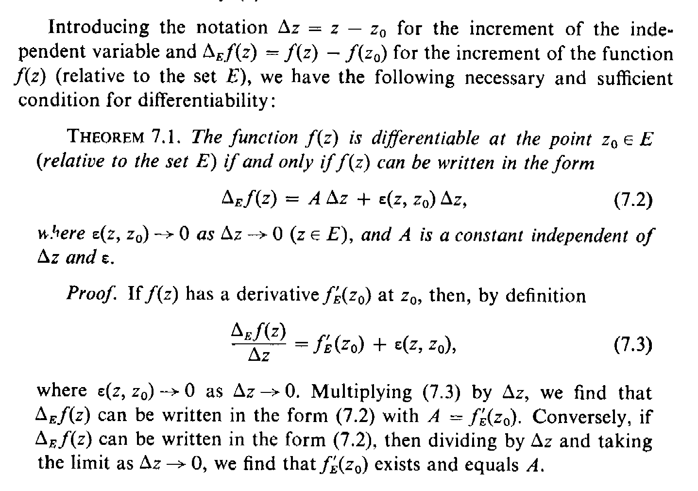 where $$\epsilon ( z, z_0 ) \to 0$$ as $$\Delta z \to 0$$. ... ... "Now previously in Equation 7.1 at the start of Chapter 7, Markushevich has defined $$f'_E(z_0)$$ as follows: