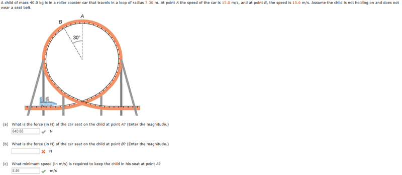 :[/B]A child of mass 40.0 kg is in a roller coaster car that travels in a loop of radius 7.30 m. At point A the speed of the car is 15.0 m/s, and at point B, the speed is 15.6 m/s. Assume the child is not holding on and does not wear a seat belt.