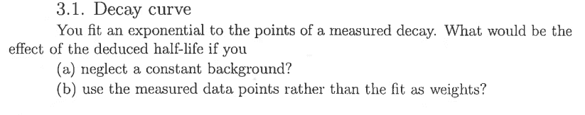 - Participants are questioning the meaning of "constant background" and its implications for deducing half-life. There are inquiries about the relationship between statistical error and standard error, as well as the underlying distribution related to the data. Some are attempting to connect the Poisson distribution to the concept of variance as a weight in fitting.