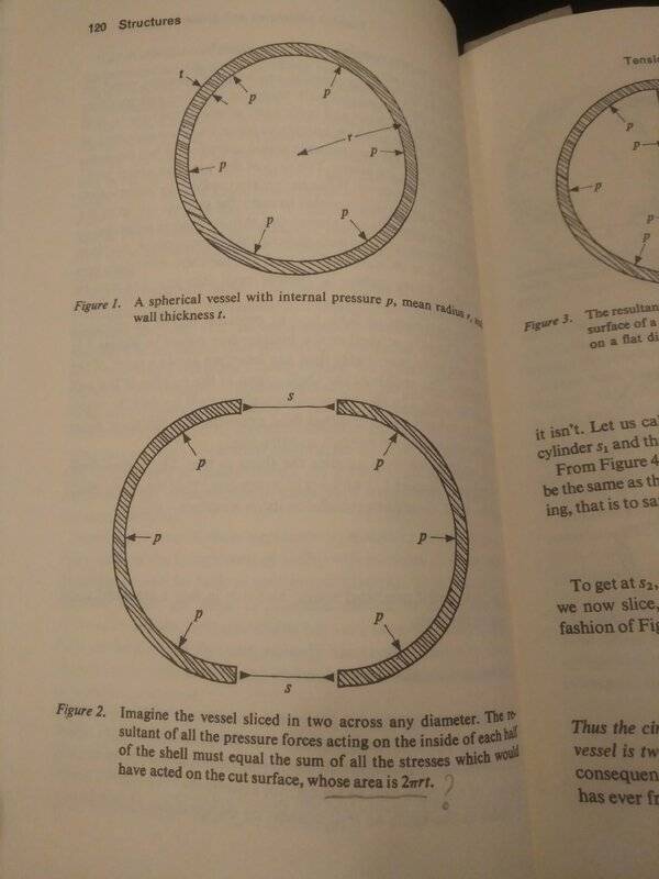 The pages shown in the pictures are from an engineering book. I am not sure how the thickness of sphere plays a role in the inner surface of the sphere. I know that the surface area of sphere is ##4 \pi r^2 ## .