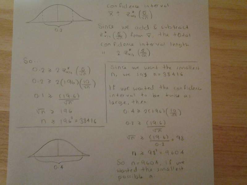 You have a random sample of size n from a normal distribution with unknown mean μ and variance 100. You want to find n large enough so that the length of the confidence interval (from left endpoint to right endpoint) is at most .2. Find such a value of n so that n is as small as possible. If you instead were willing to have a confidence interval with twice this length, what would you need to do to n? (Note: All confidence intervals in this problem are 95 percent confidence intervals.)