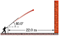 You throw a ball with a speed of 31 m/s at an angle of 40.0° above the horizontal directly toward a wall (Fig. 4-35). The wall is 22.0 m from the release point of the ball.