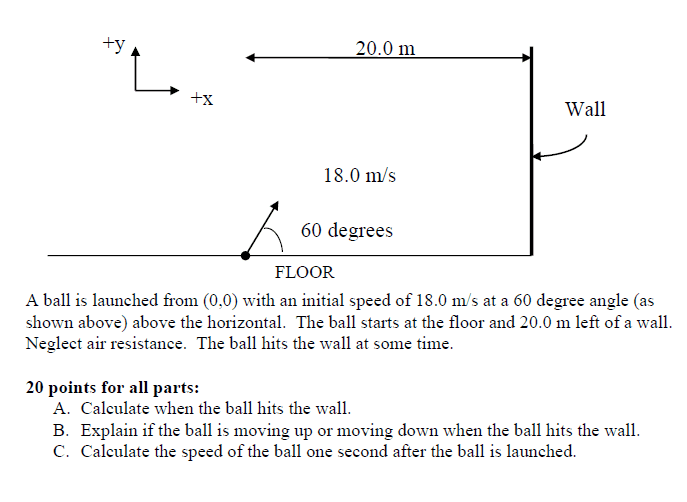 A ball is launched from (0,0) with an initial speed of 18.0 m/s at a 60 degree angle (as shown above) above the horizontal. The ball starts at the floor and 20.0 m left of a wall. Neglect air resistance. The ball hits the wall at some time.