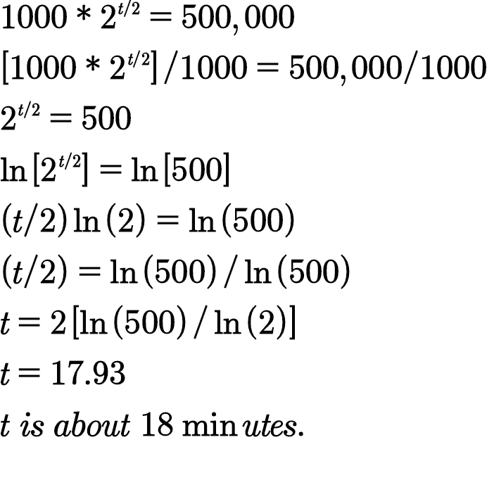 The discussion revolves around calculating the time required for a bacteria population to grow from 1,000 to 500,000, given that the population doubles every 2 minutes. Participants explore the mathematical modeling of exponential growth and the steps needed to solve for time.