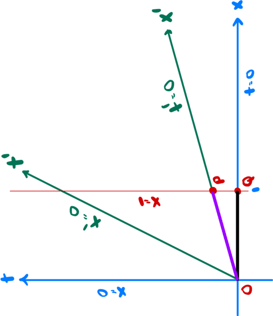 The black line from (0, 0) to (1, 0) represents a meter stick in my stationary frame, call it frame A. The blue axes represent my coordinate system with coordinates x and t.
