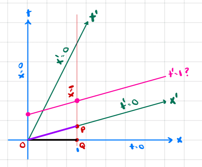 On the other hand, one end of the meter stick at a certain t>0 represented by point P (at which t'=0) is simultaneous with the other end of the meter stick in frame B.