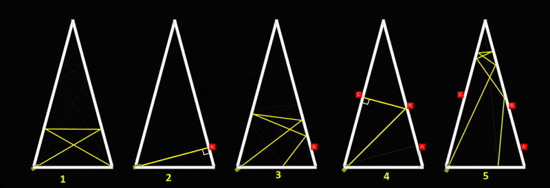 If you an isosceles triangle and you put in a corner (or somewhere else) a light beam (laser) the beam will reflect one or more times before it comes down to the base. See picture. Is there a general equation for how many times the light is reflected by the legs? Can you calculate from the angle and how many reflections there are how high the beam comes. It is evident that all beams must come down to the base again. Is there a proof for?