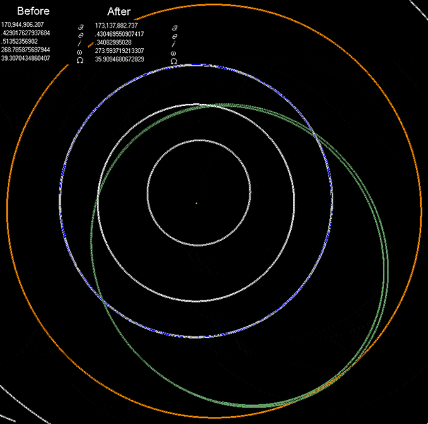 2milehi said:With the "before" orbit of YU55, there would be zero chance of the asteroid colliding with Mars since it never crosses Mars' orbit. With the "after" orbit of YU55, there are two times that the asteroid crosses Mars' orbit. This has to increase the chance of a collision between the two bodies with all things remaining the same. I assume that YU55 and Mars are on the same orbital plane.