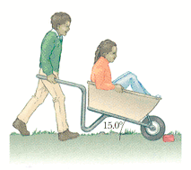 6. [PSE6 12.P.022.] Stephen is pushing his sister Joyce in a wheelbarrow when it is stopped by a brick 7.83 cm high (Fig. P12.22). The handles make an angle of 15.0° below the horizontal. A downward force of 389 N is exerted on the wheel, which has a radius of 20.3 cm.