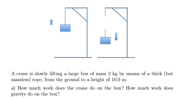- Participants explore the relationship between tension, gravity, and work done on the box. Questions arise regarding the conditions under which the box is lifted, including whether it is accelerating or moving at constant velocity. There is also a discussion about the implications of the crane's work compared to gravity's work.