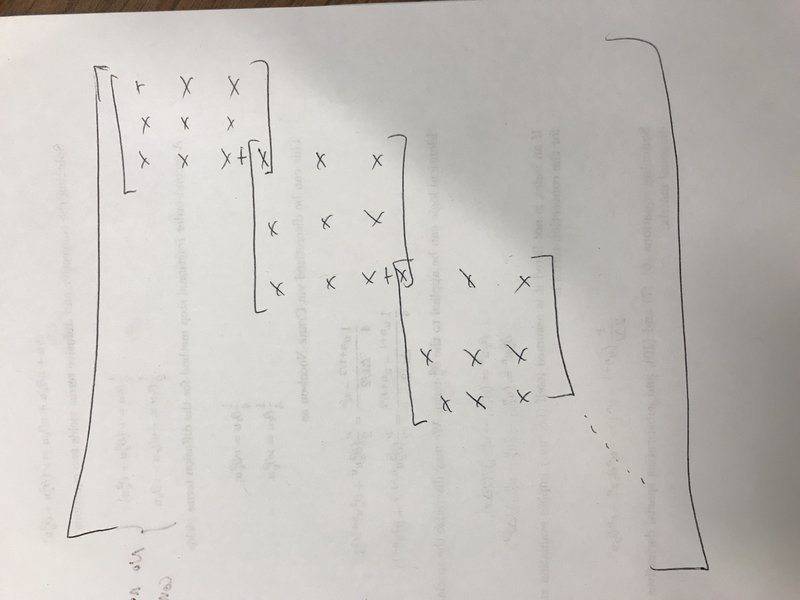 - Further clarification is provided regarding the arrangement of the matrices, emphasizing that the lower right entry of one block is also the upper left entry of the next block, leading to overlapping sums.