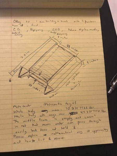The discussion revolves around the design of pontoon boats, specifically comparing dual-hulled and single-hulled designs. Participants explore concepts such as center of gravity, center of buoyancy, buoyancy, volume of displacement, metacenter, and metacentric height, seeking to understand the differences in design approaches and relevant formulas.