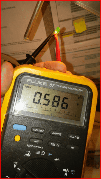 LED under a lamp with DVM measuring the voltage (Red positive lead on the LED anode):