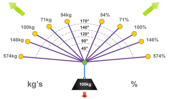 If you take the fact that ropes suffer 5 times more tensil strength around 170º degrees of angle, then you would need 5 times more energy: