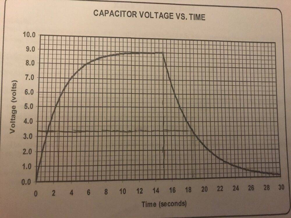 Using the Capacitor voltage vs. time graph, I calculated the time constant τ when the switch is closed (capacitor charging) and open (capacitor discharging). I calculated τclosed = 2.5s and τopen = 3.75s.