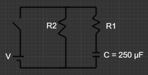 The problem states: "The circuit contains an ideal battery, two resistors and a capacitor (C = 250 μF). The switch is closed at time t = 0, and the voltage across the capacitor is recorded as a function of time in the graph. Calculate the resistances R1 and R2".