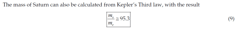 - Detailed derivations are presented, showing the calculations for the ratios of the moons of Saturn and Earth, with specific values for their periods and distances.