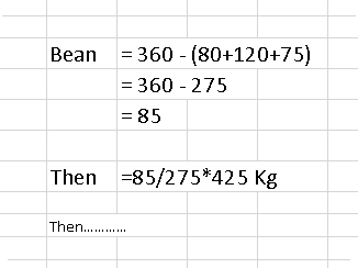 - One participant calculates the ratio of beans to sugar based on their respective angles (85° for beans and 80° for sugar) and attempts to find the amount of sugar corresponding to 425 kg of beans.