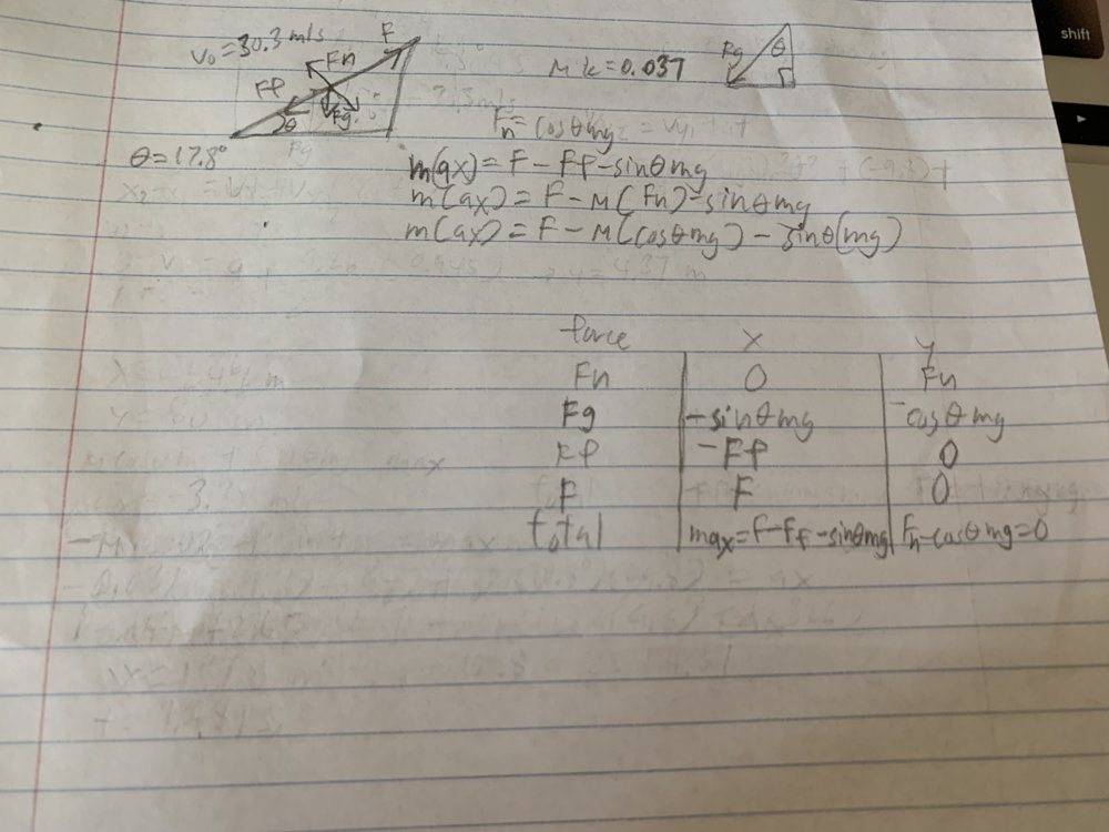 I made a component diagram of the forces acting on the skier. I got a horizontal force equation as m(ax) = F - u(cos17.8)mg-sin(17.8)mg, but am confused on how to proceed forward.