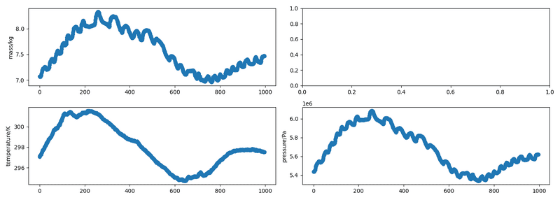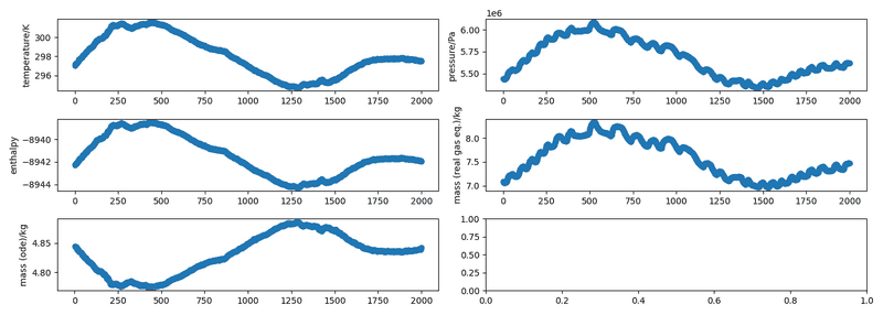 I'm aware my approach seems different from what you've been doing in the thread. Maybe what I'm doing is oversimplified and won't capture the actual behavior you're observing experimentally. Still, since you're getting some strange artifacts from your current approach to the problem, it might still be worth trying this method and comparing the results. I assume the differential equations should produce a non-stopping decline in mass within the tank as long as there is a mass output. Pressure and temperature will remain constant until there is no more liquid and then you switch to ideal gas or something similar because your experimental data is enough to determine the mass without having to solve a differential equation.