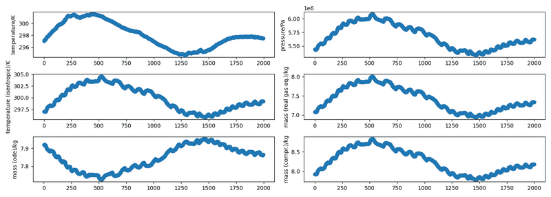 The discussion revolves around calculating the mass of gas in a tank under specific conditions, including varying pressure and temperature, and the presence of both gas and liquid phases. Participants explore theoretical models and equations relevant to thermodynamics and fluid dynamics, while addressing complexities such as thermal inertia and phase changes.