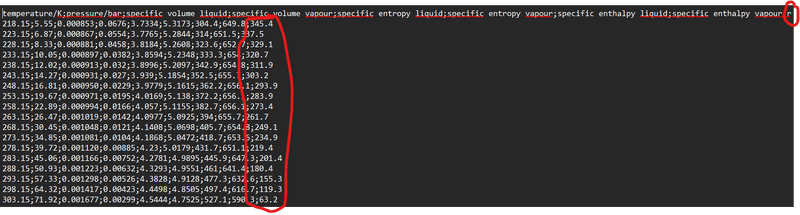I switched the axes, because it fits better with the phase diagrams I know. Orange is the interpolated vapour-liquid-limit from my table.