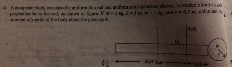 I tried to get the moment of intertia of rod by integration from -L/4 to 3L/4 , but i cannot get the intertia of sphere around the axis ,