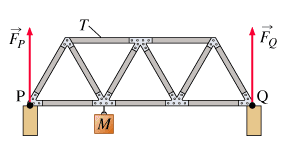 A bridge, constructed of 11 beams of equal length L and negligible mass, supports an object of mass M as shown in the picture.