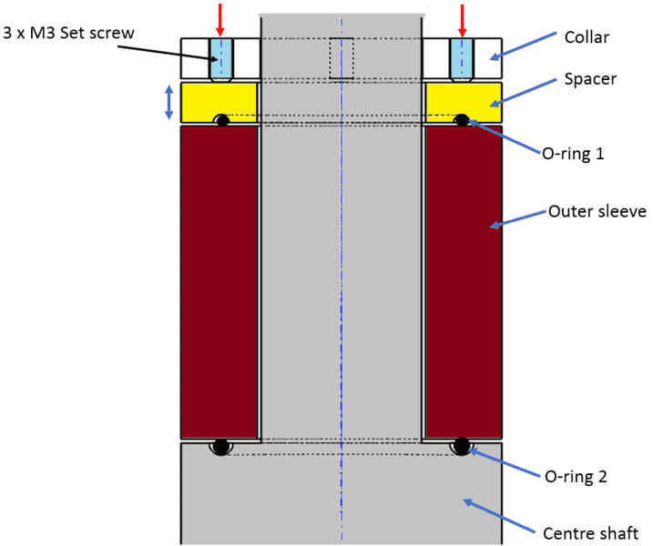 Problem statement: Please refer the image. O-ring 1 at the spacer will compress the Outer sleeve against O-ring 2 by means of tightening the set screws in the collar. The spacer is movable (floating position) and collar is fastened with shaft (fixed position). When the set screw is tighten, the spacer moves and compress the O-ring (1) against outer sleeve.