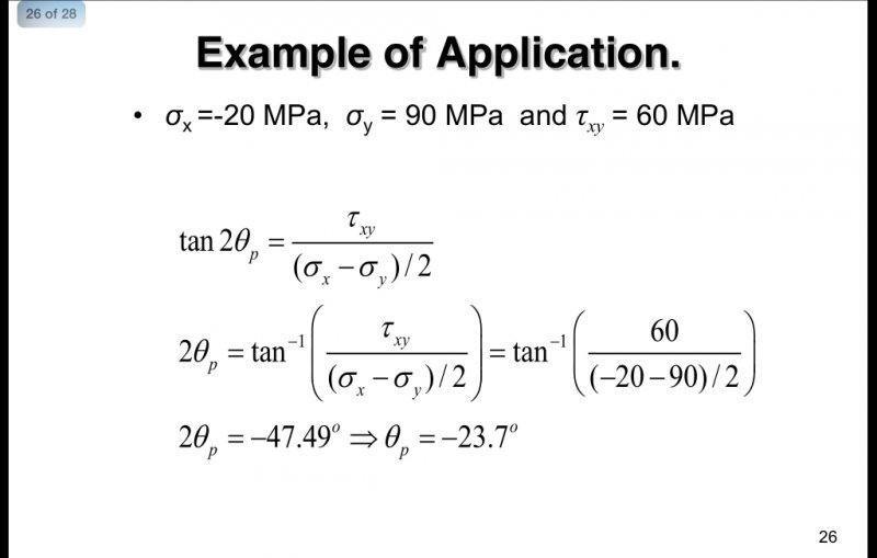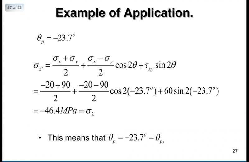 The discussion centers on the application of the plane stress transformation equations to determine the principal stresses SigmaX' and SigmaY' at an angle of -23.7 degrees. Substituting this angle into the equations yields SigmaX' as -46.42 MPa and SigmaY' as 116.4 MPa. The key question raised is how to definitively associate the angle -23.7 with SigmaX' instead of SigmaY'. Understanding the relationship between the rotation angle θ and the transformed axes is crucial for clarity in this context.