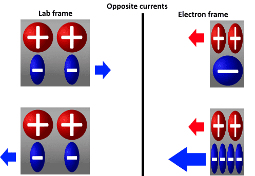 The discussion revolves around the relationship between electromagnetism and relativity, particularly in the context of superconducting rings and the behavior of electrons and protons in current-carrying wires. Participants explore various animations and explanations related to electron spacing, charge density, and the implications of relativistic effects on these particles.