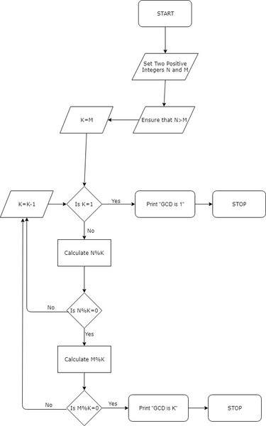 So my logic is taking 2 numbers and then choosing the small one. Then dividing the small number with both numbers by reducing 1 in each step. And when the remaining is zero for both numbers we will now that that number "K" is the GCD
