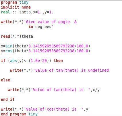 I am doing a program using gfortran compiler. I feed angle theta in degrees to the program. Program is supposed to calculate the value of tan(theta) using values of sine and cosine of theta. the program should give warning of division-by-zero if magnitude of cosine theta is less than 10-20. I have attached the code in jpg file...