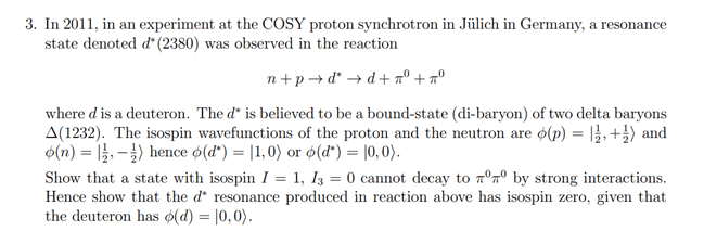 Hi, I have attached the question to this post. I understand on the process on getting to the answer in that you use $$\arrowvert 2, 2\rangle=\arrowvert 1,1\rangle \otimes \arrowvert 1,1\rangle$$ and apply the isospin-lowering operator to obtain $$\arrowvert 2,1 \rangle$$. Then I understand you then use orthogonality $$ \langle 1,1 \arrowvert2,1 \rangle=0$$ to obtain the composition of $$\arrowvert 1,1 \rangle= (\langle 1,1 \arrowvert)^{\dagger} $$. But I'm unsure on how to actually get to each step and I'm not sure on where to go from this point. Any help will be much appreciated.