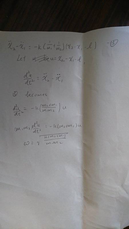 oscillatory motion of the system. [Hint: write down the equation of motion of each mass in