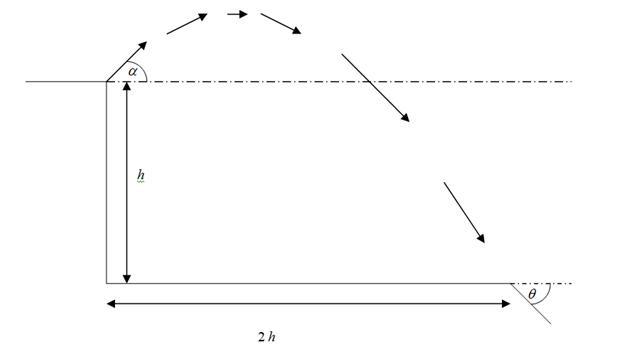 A particle is projected at an angle alpha above the horizontal from a point on the edge of a table of height h standing on a horizontal floor. The particle reaches the floor at a point whose horizontal distance from the point of projection is 2h. Show that when it strikes the floor, the inclination theta below the horizontal of its direction of motion is given by