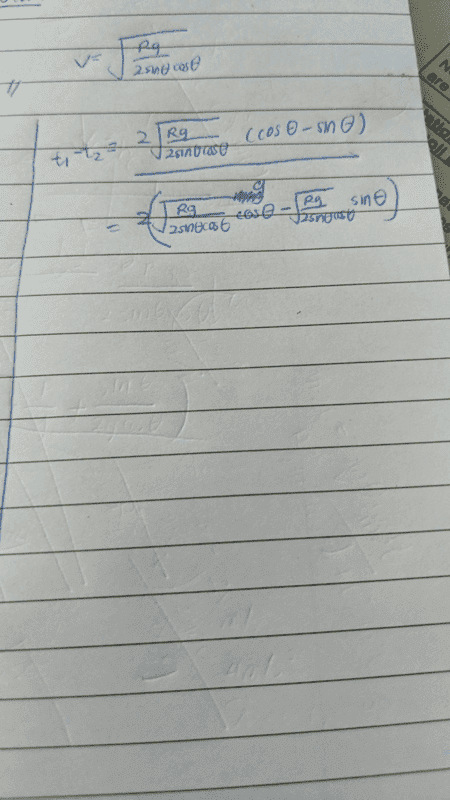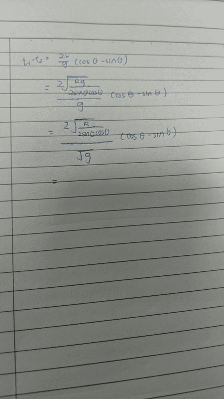 The discussion revolves around deriving the time taken in projectile motion, specifically focusing on the relationships between various parameters such as initial velocity, angle of projection, and distance traveled. Participants are exploring the mathematical expressions that govern these relationships.