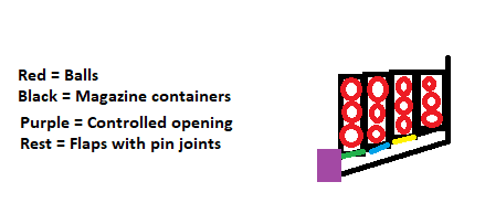 One idea that seemed promising was the use of "magazine" type containers to allow 1 input at a time. In this mechanism balls in the right most column move out first and then corresponding column on the left is emptied. The colored "flaps" remain shut due to the presence of balls in the common duct until no balls remain beneath the flaps.The problem with this mechanism is that: