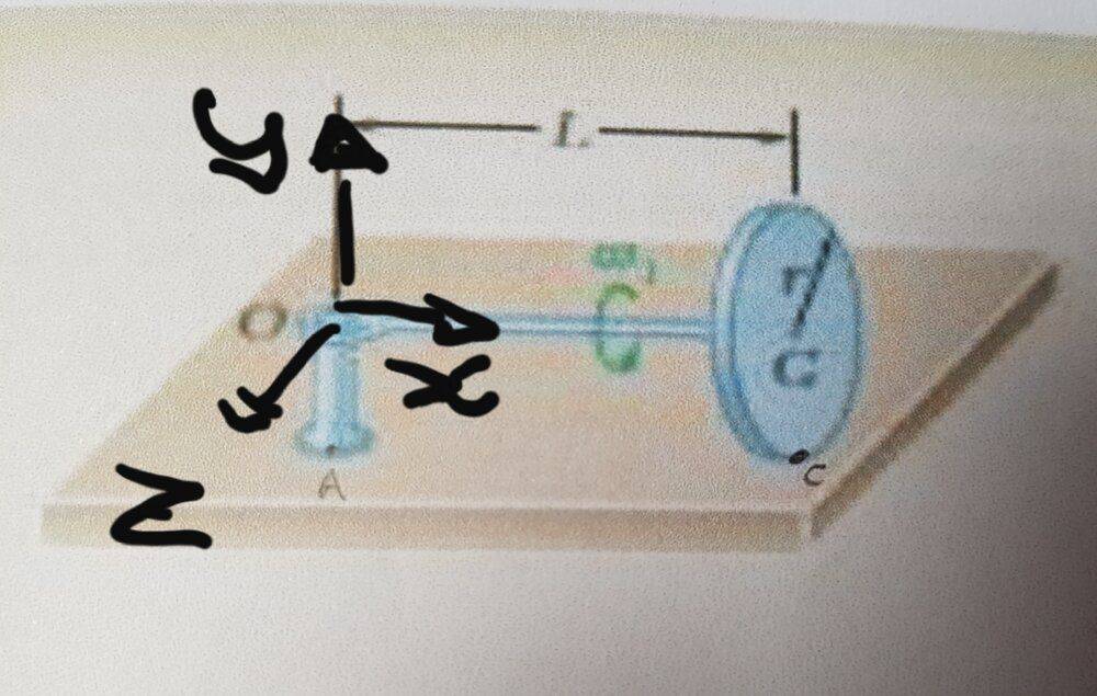- An homogenous disk of radius ##r## and mass ##m## rotates about the point ##O## with ##\omega_2## and is restricted to move in a horizontal plane. It also rotates about the point ##G## with constant angular velocity ##\omega_1##. Determine the reaction forces on ##A##, ##O## and ##C##. Consider that the bar of length ##L## has no mass.
