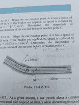 - When the car reaches point A it has a speed of ##25m/s##. If the brakes are applied, its speed is reduced by ##a_t = -\frac 14 \sqrt{t} \frac {m}{s^2}##. Determine the magnitude of acceleration of the car just before it reaches point ##C##.