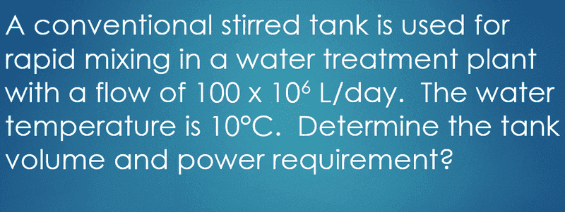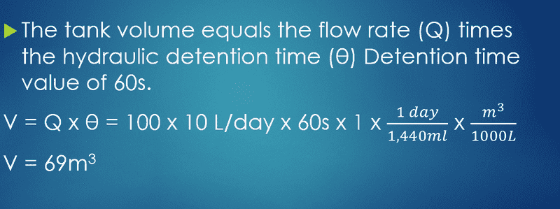 The discussion revolves around determining the tank volume and power requirement for a tank that is filled and emptied every 60 seconds. The problem involves understanding hydraulic detention time and the conversion between liters and cubic meters.