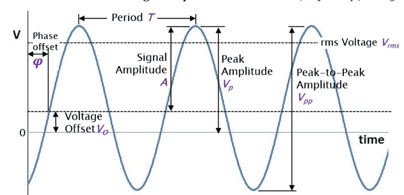 Given the wave form, determine the period, frequency, peak amplitude, peak to peak amplitude, voltage offset, phase angle, signal equation, rms voltage.