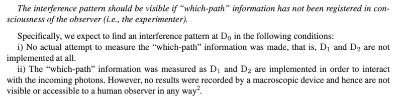 Consider a double slit experiment with detectors at each slit but which have no memory of their own, and which each relay the w-w information to a recording device that stores the information in a readable way to a conscious observer. Now run the experiment with the detectors on and the recorders off. Standard Quantum Theory says that the detection events resolve the which way information, and regardless of whether or not it is made available to any conscious observers there will be no interference pattern. The information exists *in principle* in the universe, and that is enough. Yet Von Nuemann-Wigner says that if the recorders are not recording the w-w information, such that it will be impossible for any conscious observer to ever read it, then we should see an interference pattern despite the fact that the detectors have resolved the which way information. Turn the recorders on and the interference pattern disappears. There is a definite contradiction, and different experimental predictions.