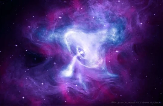 - According to generally accepted ideas, the pulsar in the Crab Nebula is a single non-accreting neutron star, and the excess of X-ray radiation in its spectrum is explained by its young age and high surface temperature. However, in the X-ray photo of the Crab Nebula, a vortex of gas around the pulsar is clearly visible. Moreover, a cone of radiation is visible coming out of the pulsar in the center of the vortex, which is directed far from our direction.