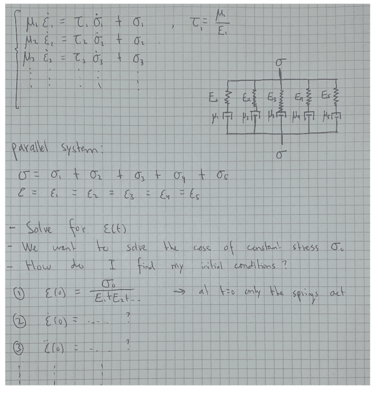 I am trying to solve a differential equation corresponding to a visco-elastic material model consisting of 5 units of springs and dashpots connected in parallel as can be seen in the image below. I am able to come-up with a single fifth order ODE, however I am struggling to find the initial conditions for t=0. The differential equation is solved for epsilon(t) and is subject to a constant stress sigma_0. I am able to come-up with the first initial condition as can be seen in the image but I don't know how to find the remaining 4 conditions. Please help!