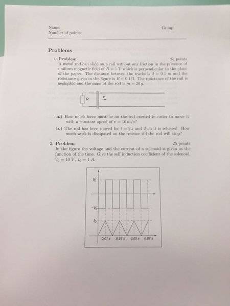 A metal rod can slide on a rail without any friction in the presence of uniform magnetic field of B=1T which is perpendicular to the plane of the paper.The distance between the tracks is d=0.1m and the resistance given is R=0.1 ohm.The resistance of the rail is negligible and the mass of the rod is m=20g. A)How much force must be on the road exerted in order to move it with a constant speed of v=10m/s? B)The rod has been moved for t=2s and then it is released.How much work is dissioated on the resistor till the rop will stop?