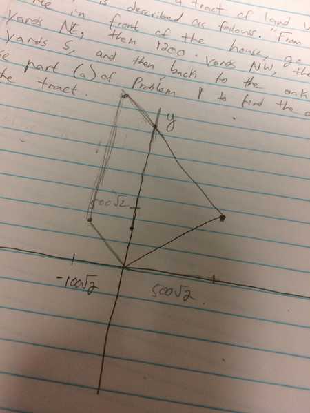 You have inherited a tract of land whose boundary is described as follows. ”From the oak tree in front of the house, go 1000 yards NE, then 1200 yards NW, then 800 yards S, and then back to the oak tree.
