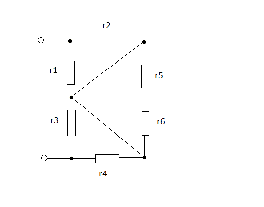 Calculate equivalent resistance of the circuit (figure1), if all six resistances are the same: r1 = r2 = r3 = r4 = r5 = r6 = 100 Ohm.